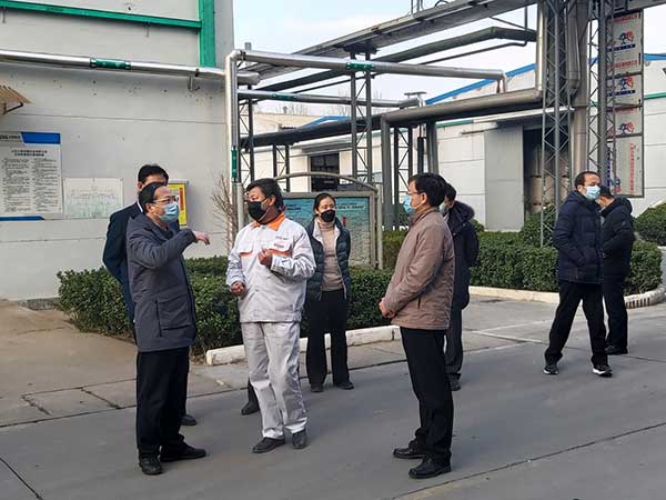 2020年2月11日下午,山東省副省長於(yú)傑在市委書記劉文強的陪同下,到我公司督查防疫消殺物資生産情況。督查組先後查看瞭(le)DCS控制室、防疫物資裝卸區、消毒片生産車間,董事長邵長銀介紹瞭(le)防疫物資生産、發送情況。